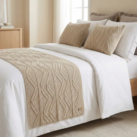 Confeccionado com fios 100% acrílicos de alta qualidade, o Kit Peseira Helena oferece uma textura macia e um toque irresistível, que envolve sua cama com suavidade e estilo. A trama delicada do tricô confere um visual exclusivo, enquanto as duas capas de almofada acompanham o mesmo design, podendo ser confeccionadas nas medidas que você escolher, garantindo total personalização para o seu espaço.